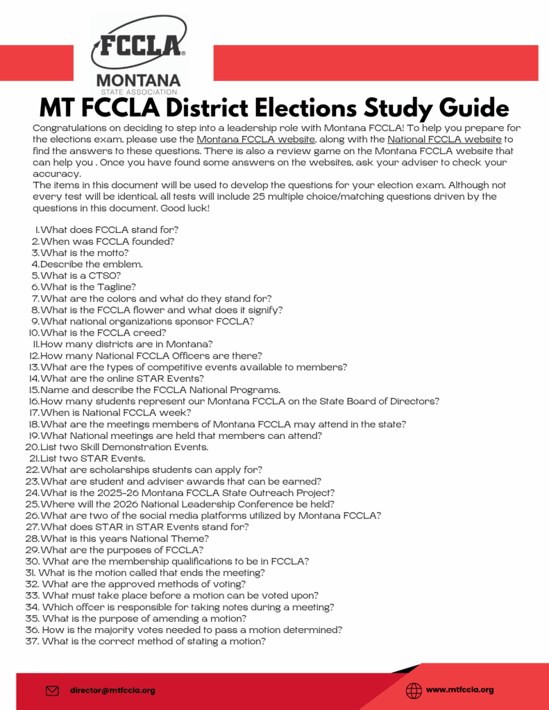 2) Open the Study Materials document. Use the National FCCLA website and the Montana FCCLA website to help you find the correct answers and prepare for the officer exam. The exam will be open the first full week prior to your District Meeting.