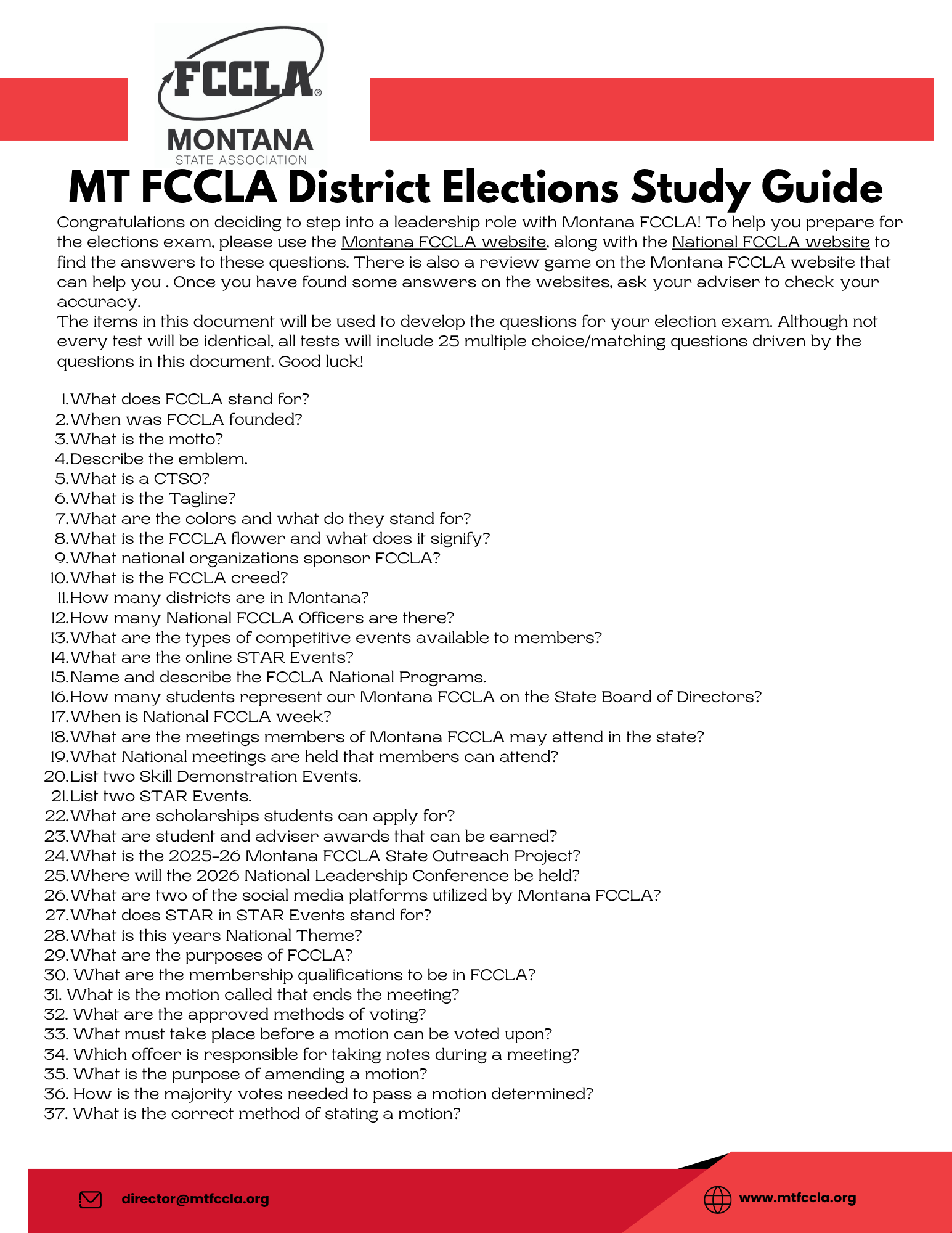 2) Open the Study Materials document. Use the National FCCLA website and the Montana FCCLA website to help you find the correct answers and prepare for the officer exam. The exam will be open the first full week prior to your District Meeting.