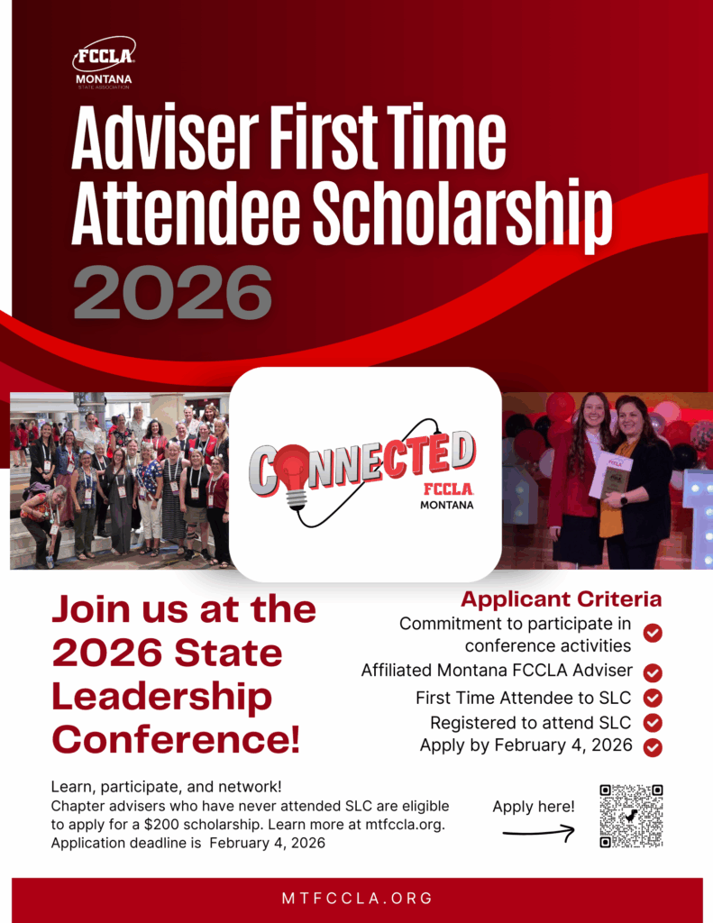 All advisers who have never attended a Montana State Leadership Conference before are invited to submit an application for the First Time Attendee Scholarship. Full details are found on the flyer below. Registration is open through February 4.